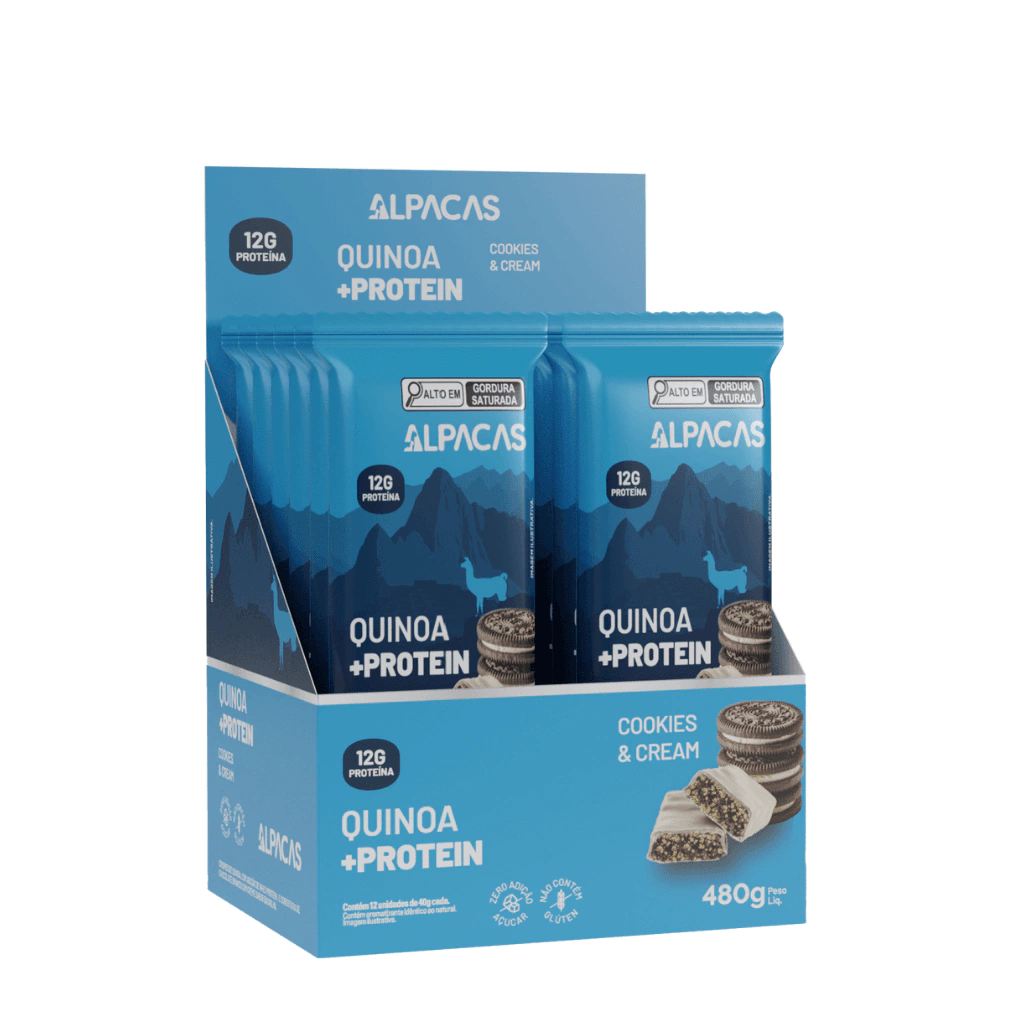 O DISPLAY CONTÉM: 12 de barras de proteína de quinoa Coockies & Cream.